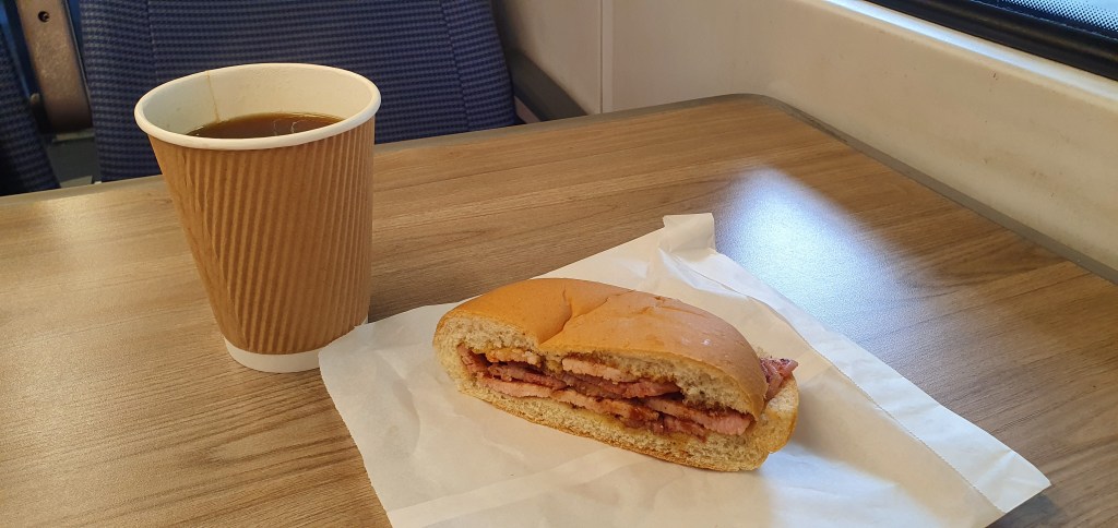 Slight change of plan. I was going to walk along the canal from Huddersfield to Milnsbridge but I got distracted by the delious smells emenating from the station buffet so I popped in for a chat with Chris and his wife and to purchase one of their delicious bacon teacakes (as they call rolls in this part of the world) and a coffee.