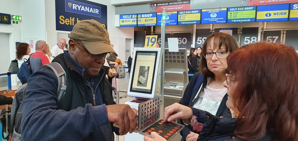 Oh, the fun of Manchester Airport and Ryanair check in. The self bag drop is farcical. Half the label printing machines are broken. When you do get your bag labelled you join another queue to drop off your bag. But there’s only one person doing it. Then the belt’s broken! So we’ve been standing here for nearly an hour! My friends have found a way of passing the time..