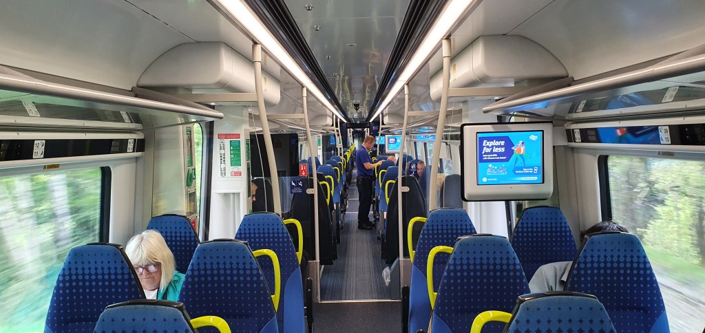Having walked down into Sowerby Bridge instead of through to Halifax I’m on my first train of the day, Northern’s 10:22 to Leeds which will carry me as far as Dewsbury. This turned out to be a wise choice as the onboard Passenger Information System (PIS) screen shows onward connections and I noticed the Grand Central service I used last week is cancelled. That would have really screwed me up! Instead I’m on a quiet 3-car Class 195 and stress-free as I’ve time in the bank.