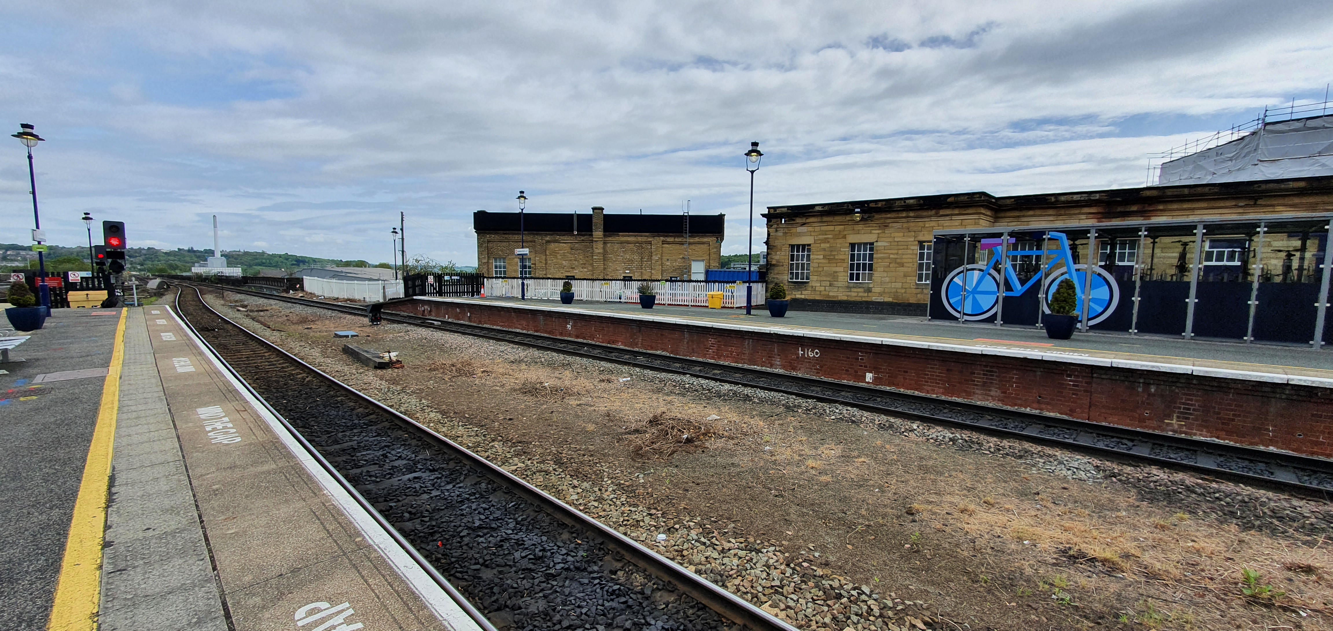 Meeting over I had a mooch around Milnsbridge for an hour and checked out a photo location I’ve not visited before on the road bridge high above the railway to the west of the viaduct and next to the old goods yard. Here’s the view looking West towards Slaithwaite