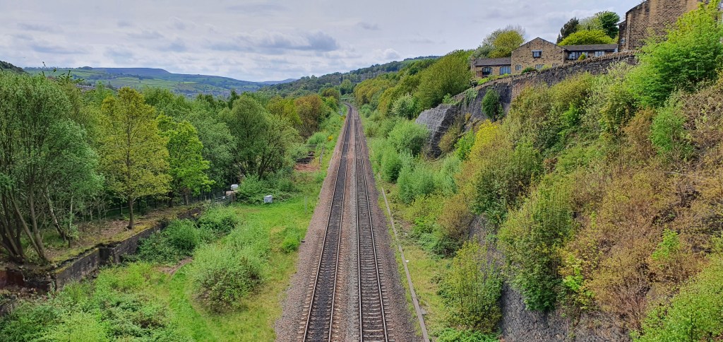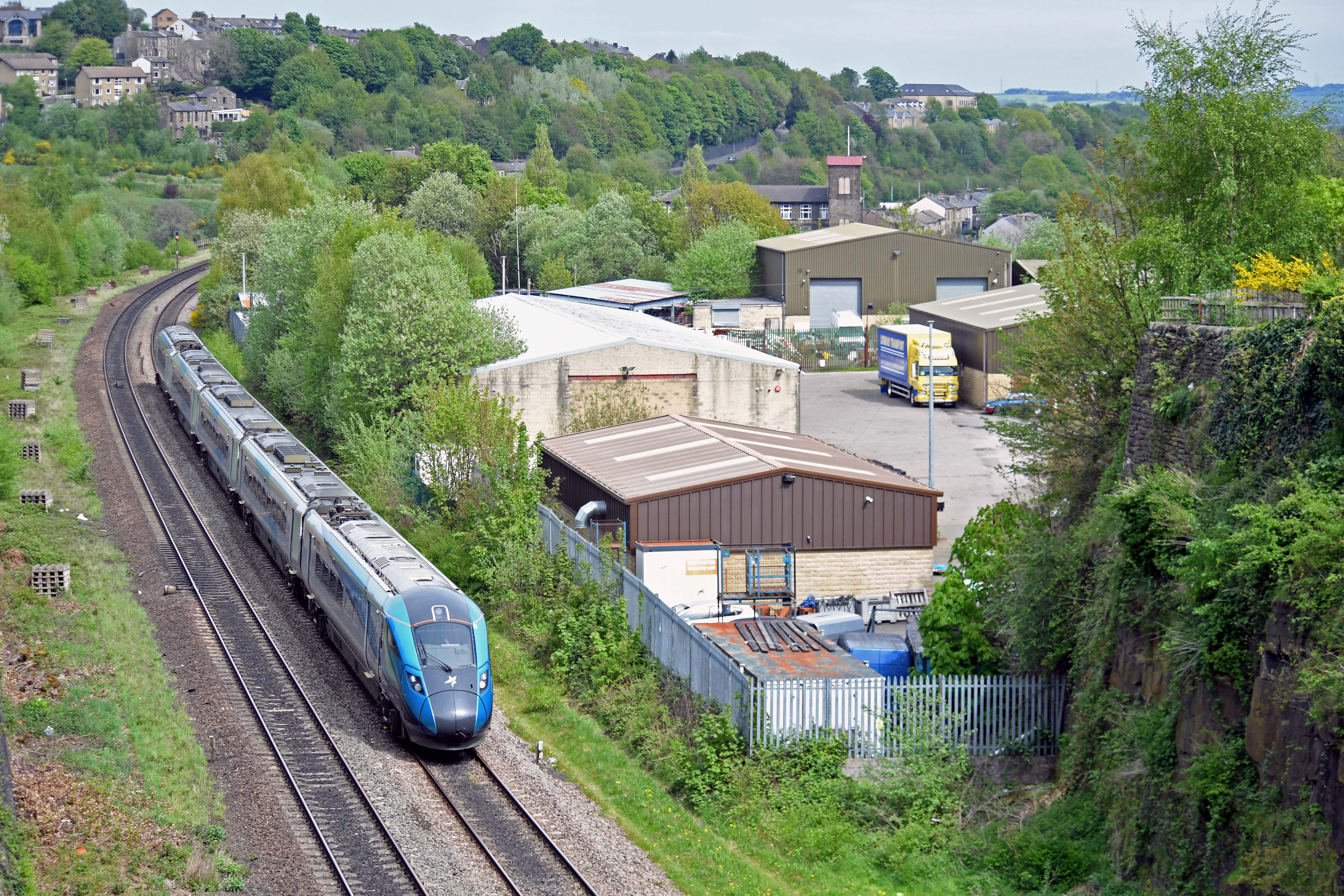 It won’t look like this in a few years time! Here’s looking in the opposite direction as 802208 comes off the viaduct and passes the site of Milnesbridge goods yard which is now an industrial estate.