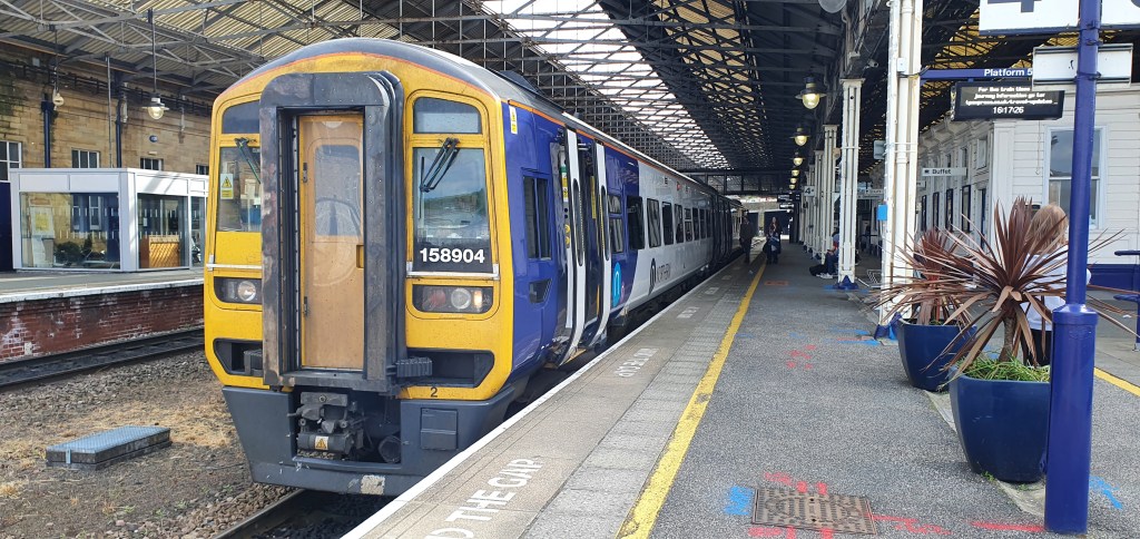 Right now I’m back at Huddersfield waiting for the 16:35 to Halifax and basking in the sun as I do so. There appears to be quite a few traincrew issues today with several services (Northern to Sheffield and TPE to Redcar) cancelled with staff shortages being given as the reason. At least my train’s turned up in the shape of a refurbished ex-West Yorkshire PTE Class 158.