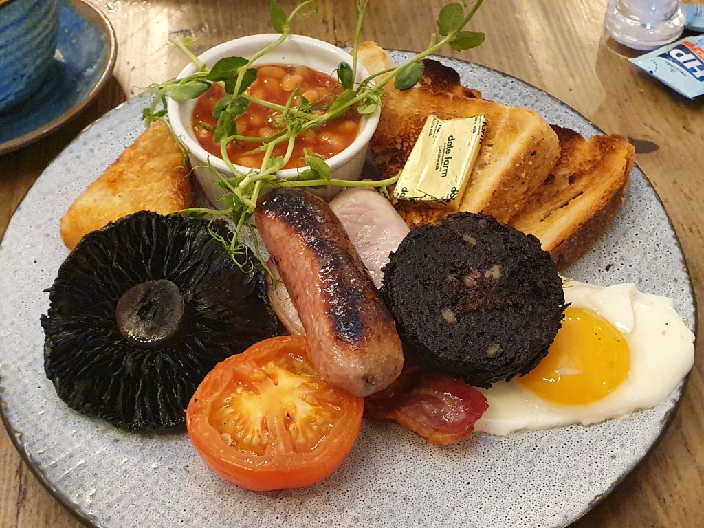 And what a convivial day it’s been! We started off by driving over to Huddersfield to have brunch with Dawn’s parents at the excellent Hinchcliffe’s farm shop in their ‘Rusty Bull’ cafe/restaurant. It’s always a treat to have someone else cooking for us – especially of a weekend. We weren’t disappointed either. The menu’s changed since our last visit. The full English still features and that was my choice as it’s something we’d rarely cook at home. Dawn plumped for one of the new dishes, Shakshouka. This was comprised of Chorizo, Smoked Bacon, Baby Spinach, Sweet Peppers and Poached Eggs, served with Sourdough Toast.