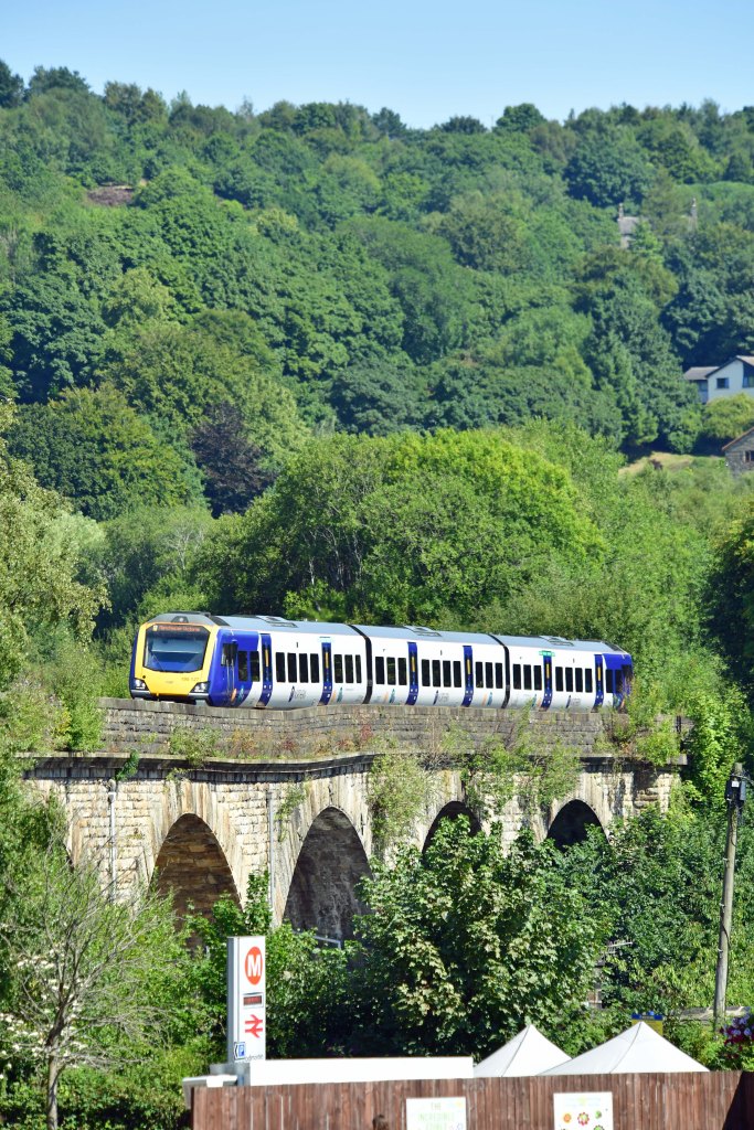 Northern’s CAF built unit number 195127 arrives at Todmorden station across the ‘kinky’ viaduct whilst working 1J15, the 12:12 Leeds to Manchester Victoria.
