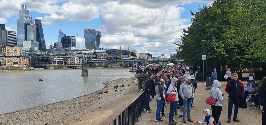 We’re now back at the hotel after yet another full day walking around London and experiencing what’s going on in the capital due to the death of Queen Elizabeth. It’s been a fascinating experience on so many levels. I’ll add more about this soon when I’ve more time to go into detail. But here’s a few shorts. As far as we could gauge (and we saw a lot of it) the queue was almost evenly balanced between genders. It was overwhelmingly older, with most folk over 30 years old – and also mostly white, although Asian communities were a significant minority with (from what we saw) the African and Afro-Caribbean less represented. It was also good-humored and stoic – despite the length of time. Here’s a few pictures from our observations.