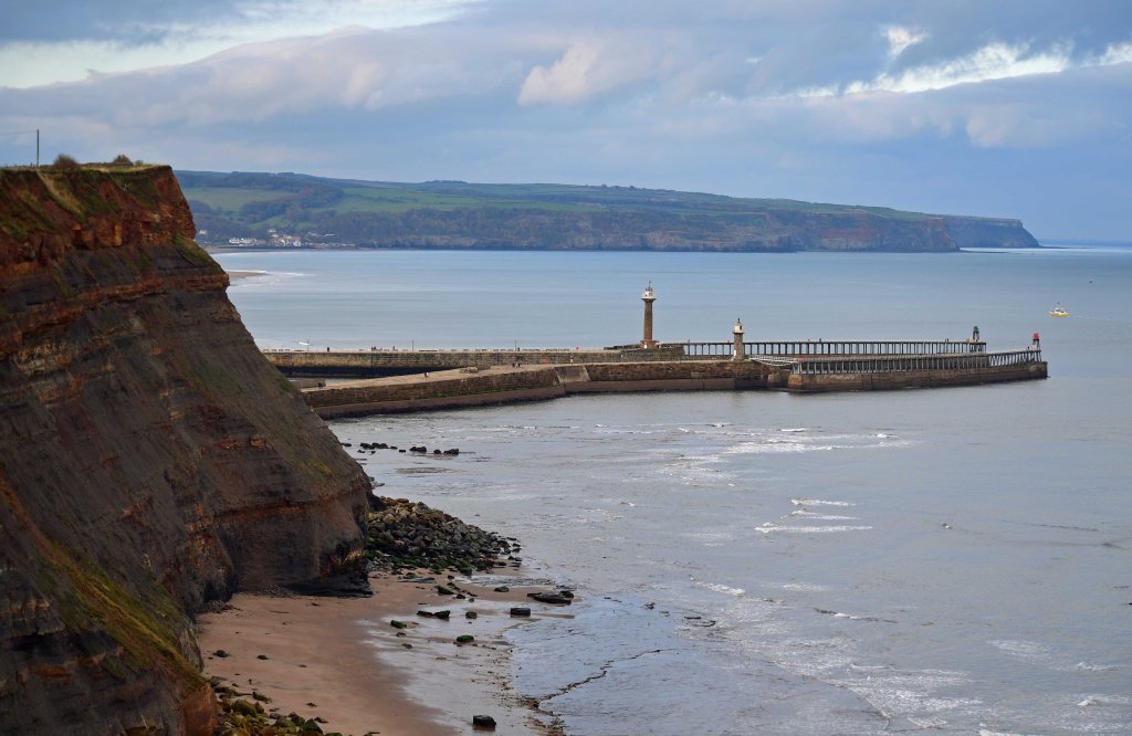 The entrance to Whitby harbour seen from the cliffs by the Abbey.