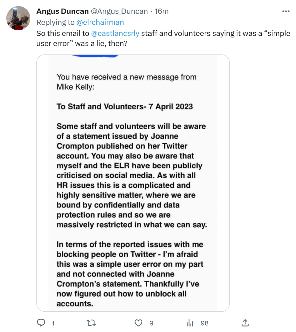A “simple user error”? That’s not what he claimed on Twitter! The idea that this ‘error’ just happened to coincide with Joanne’s sacking is laughable. Kelly hardly ever used Twitter. He only had around 300 followers. This has now mushroomed to 900 plus as people have signed up to listen to the excuses and watch the car-crash. He has no idea how Twitter works, so has made a complete fool of himself – as many more savvy people have pointed out. Some of the the responses have been savage. And the longer this drags on the more damage it does to the East Lanc’s Railway’s reputation and credibility.