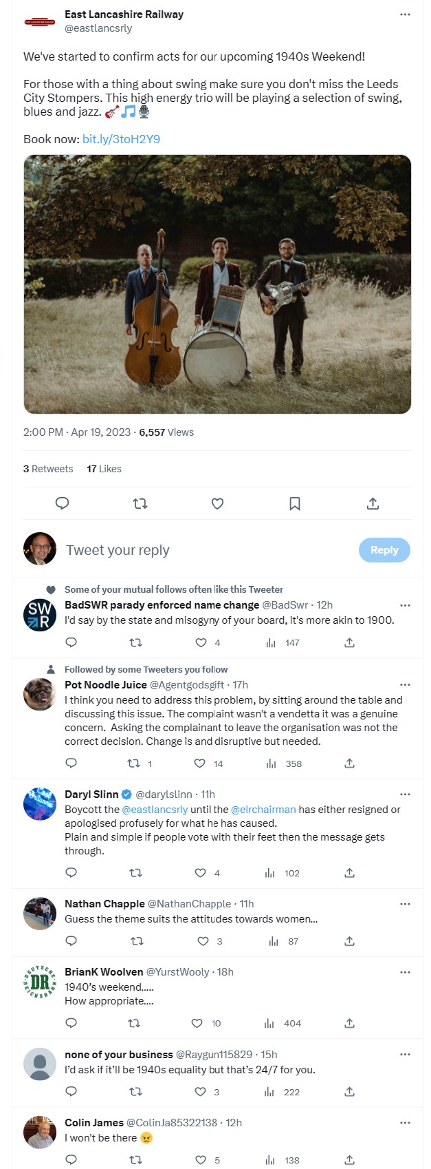I really feel for the people in the ELR publicity department as they’re having to bare the brunt of this whilst the Chair, General Manager and Board continue to stick their fingers in their ears and hide, pretending nothing’s happened and it’s business as usual. They’ve all gone to ground since 7th April, Kelly’s said nothing since his risible attempt at defending blocking people on Twitter (many of whom remain blocked) whilst nothing has been heard from the rest of the board, or the General Manager…