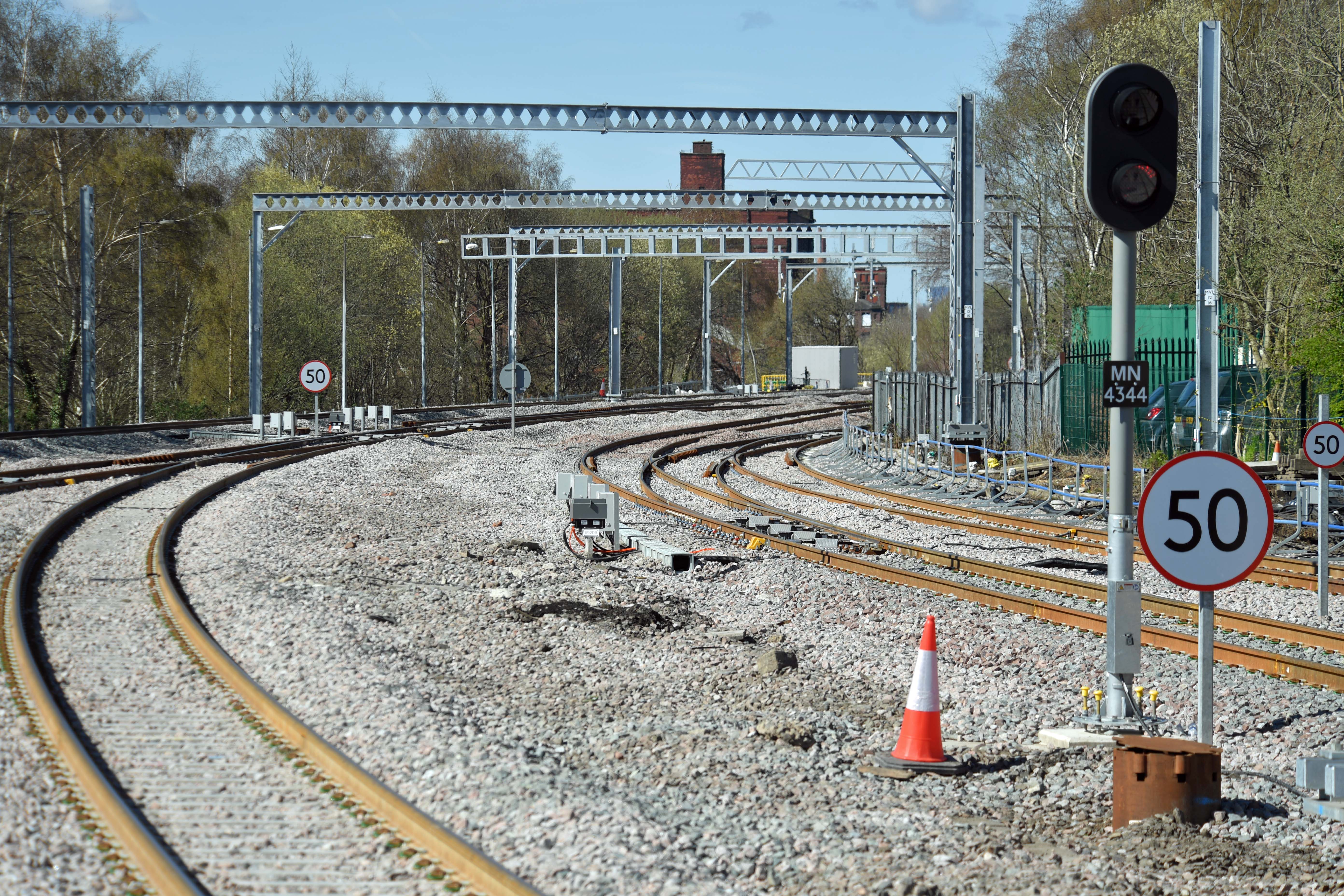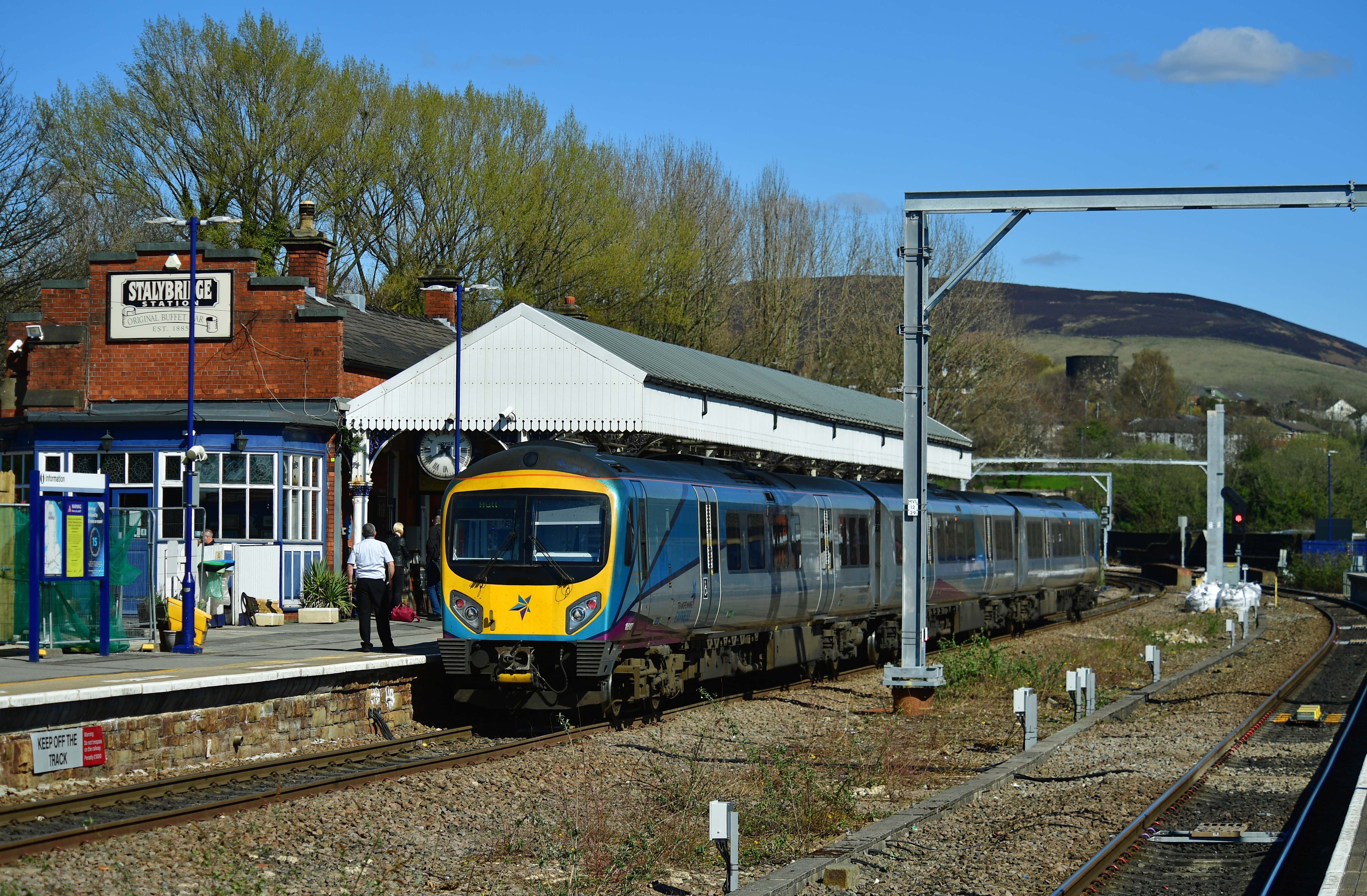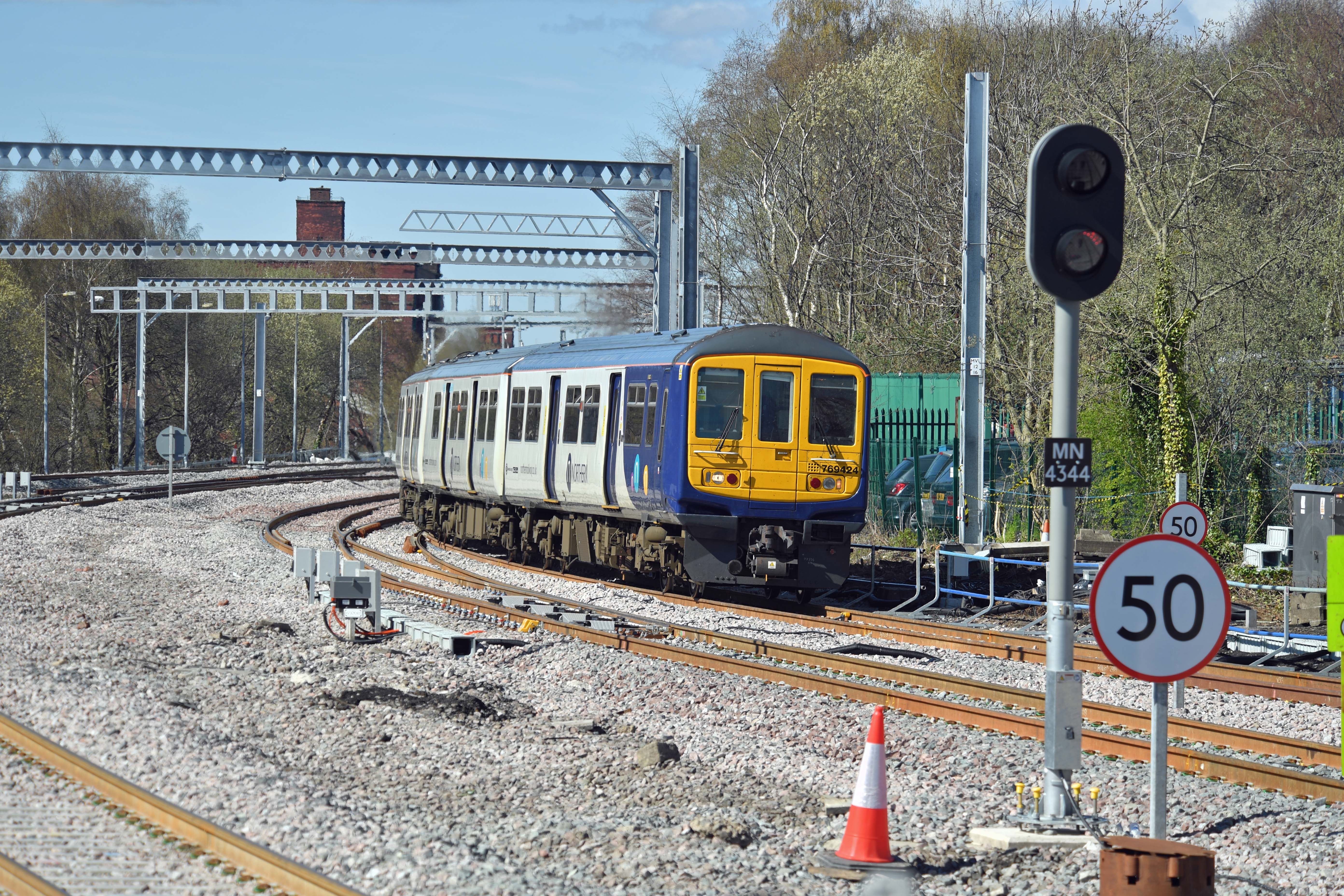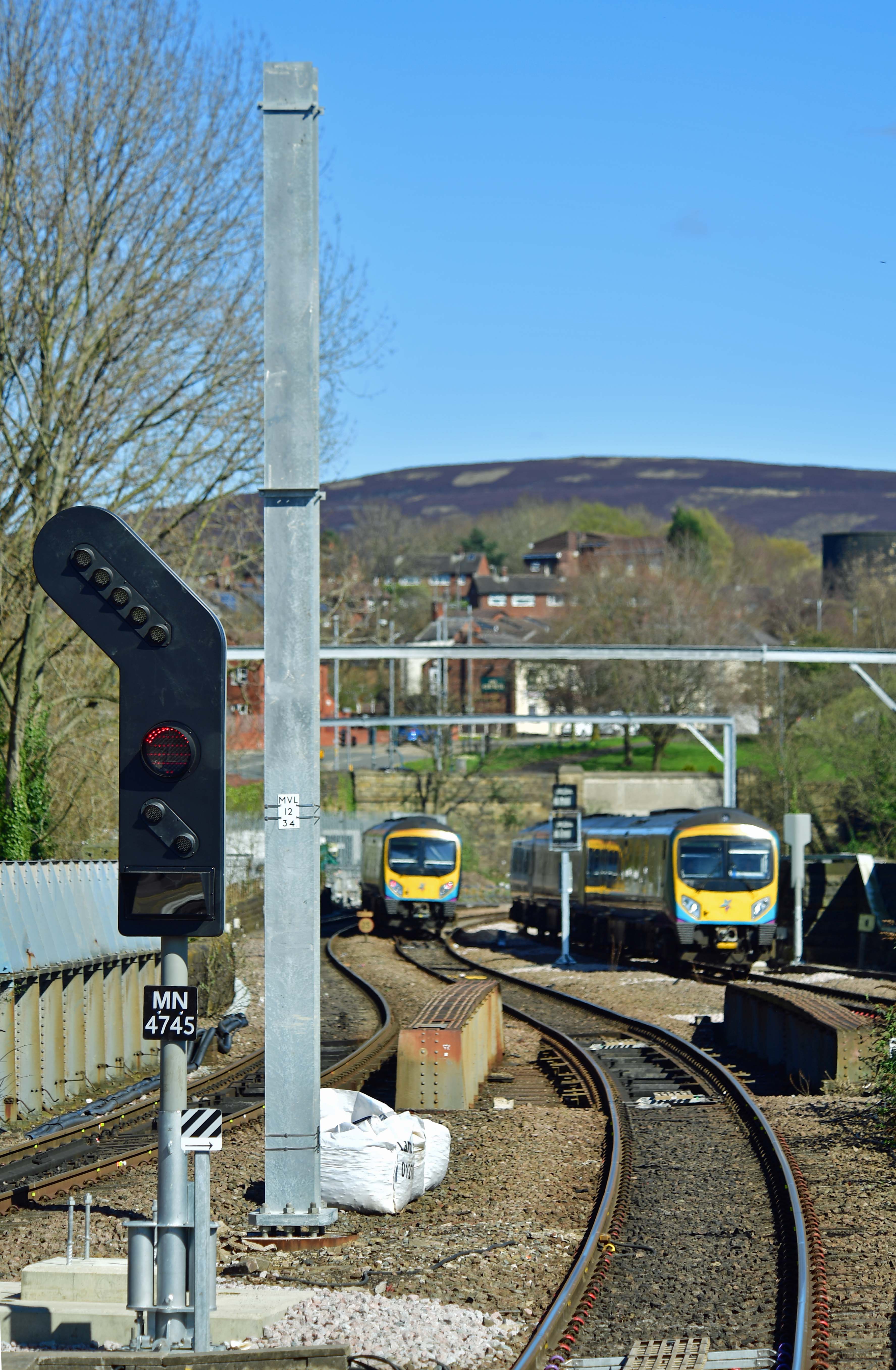 On Friday I paid a visit to Stalybridge station to see the result of the engineering blockade that had transformed the stations Western junction. This is been totally remodelled and resignalled. The resignalling has extended to the Eastern side of the station although the track layout here remains unchanged. As well as track and signals a large number of overhead electrification masts and portals have appeared, although there’s still many more to be installed at further weekend engineering possessions before the wires can be extended.