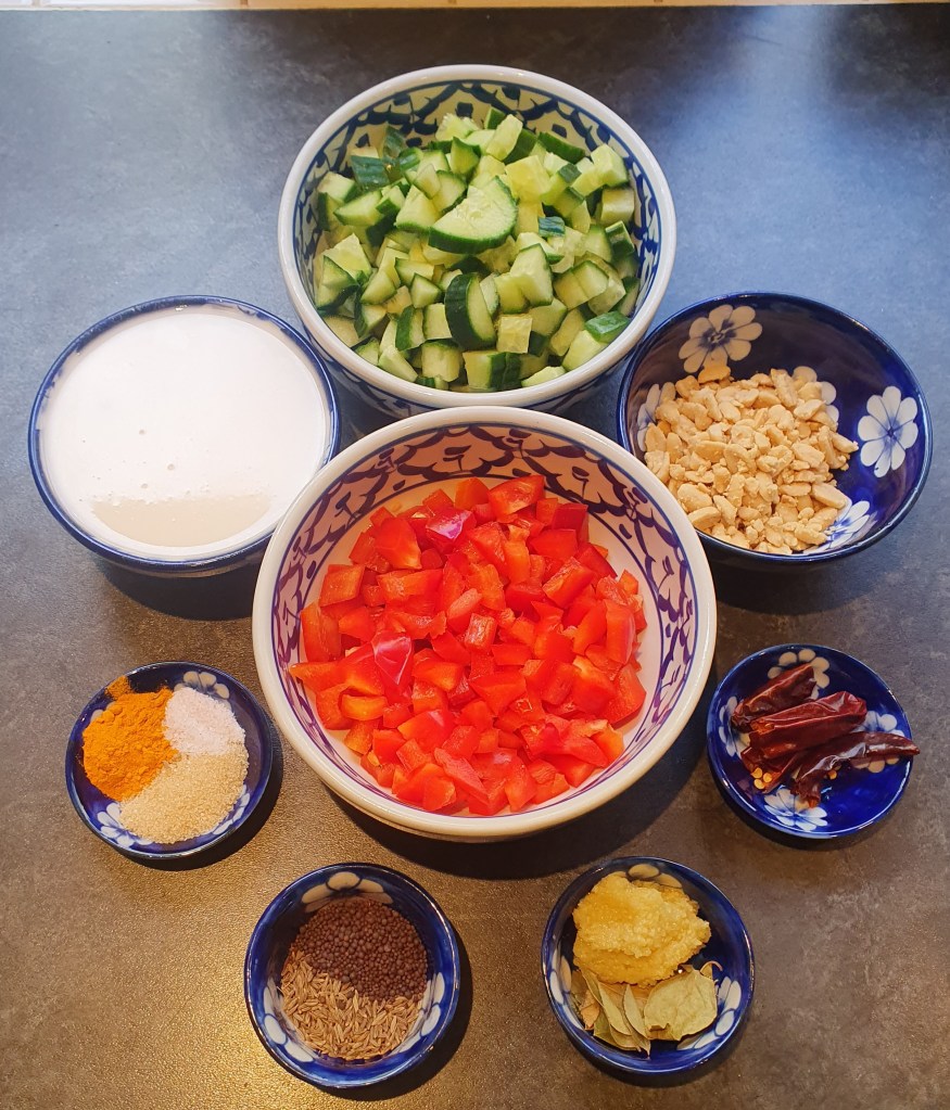 Back at home I knocked off early in order to indulge in some cooking therapy and practice making a dish I’ve not made for a while. Next week Dawn and I are taking in some home-cooked Indian dishes to the Community Rail Network office in Huddersfield for a staff gathering and I thought make one for us this evening. Cucumber curry. No – really! This is made with cucumber, red pepper, creamed coconut and a variety of spices and tastes divine. So, today’s picture was taken in our kitchen as I prepared the dish. Regular readers will know that I like to have all my ingredients pre-prepared and laid out ready for cooking. Here’s tonight’s.