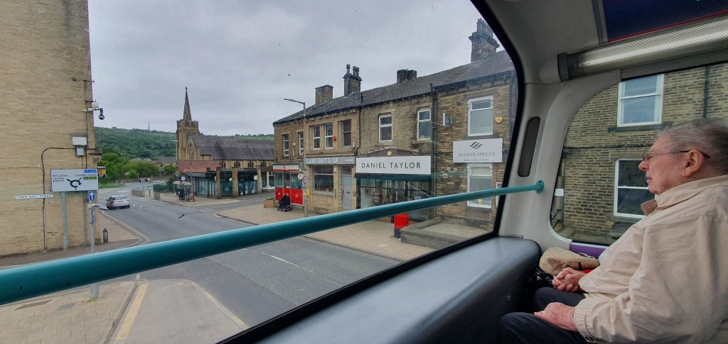 I now have a grandstand seat at the front on the top deck of the 503 bus. It’s a bit of a circular tour as it passes through Elland, a small town between Halifax and Huddersfield. It’s an odd little place on the banks of the River Calder. Once it was famous for the Gamnex clothing factory. They were made famous because former Prime Minister Harold Wilson (who was born in Huddersfield) always wore one of their Mackintosh’s. The factory is long gone and the old mill it used has been converted into housing. The town centre’s very quiet nowadays with nany businesses closed and buildings up for sale. The irony? It’s a very Brexity area and the expression ‘be careful what you wish for’ springs to mind. Still, there is a good craft beer micropub to visit where you can drown your sorrows.