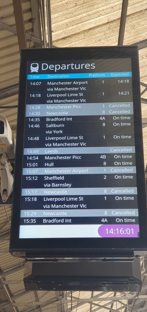 Now I’m taking the long way home via train as I’m currently en-route to Stalybridge aboard a Trans-Pennine service from Hull to Liverpool Lime St. Still, it’s good to see that the Dept of Transport taking Trans-Pennine Express back under its control has solved the problems of cancellations and poor performance. Oh, wait…