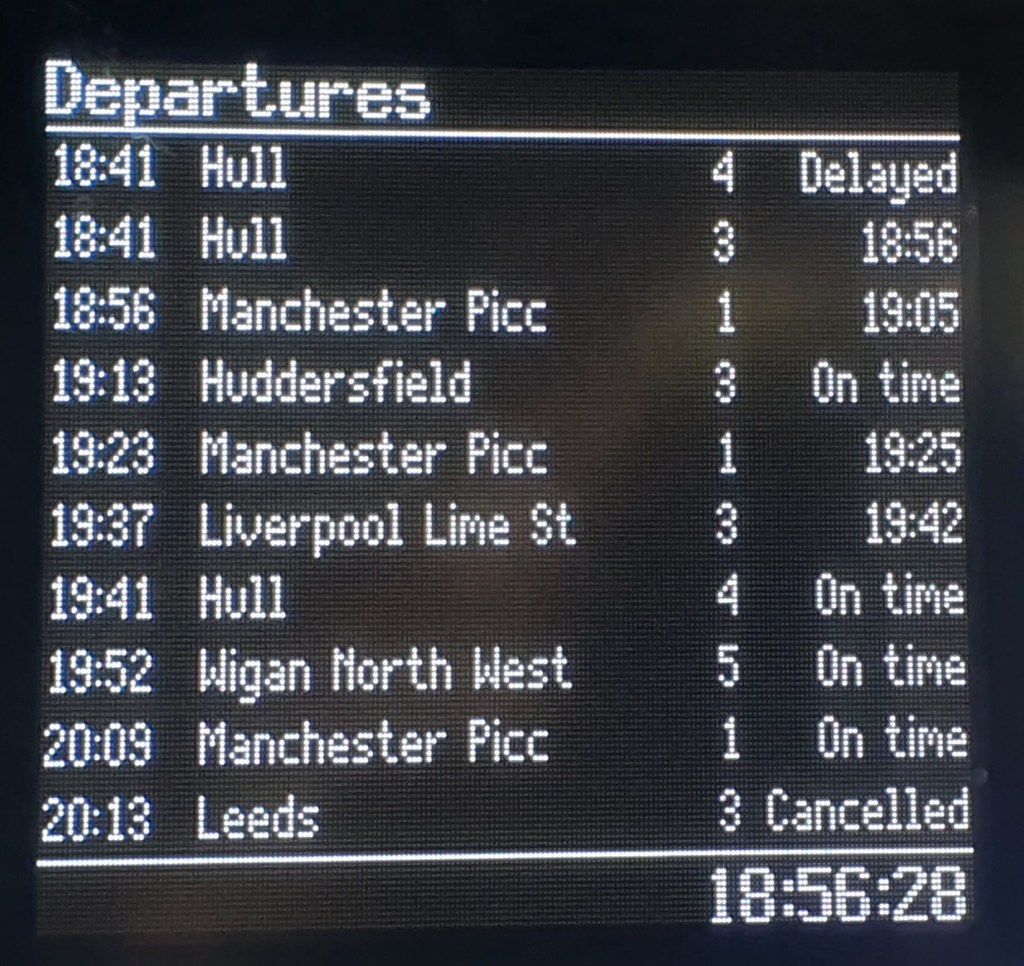 Well, that was ‘fun’. Checking on various timetables it seemed my best option for getting home was via Stalybridge and Manchester Victoria. So, I duly caught a train to ‘Stalyvegas’ where it all went a bit ‘Pete Tong’. Late running meant going via Victoria was up the spout. Still, there was always the option of getting the first train to Huddersfield and going via Halifax, right? Then the information screens and updates fell apart. I missed one train to Huddersfield as I was waiting for one to Hull that was only delayed by a couple of minutes but I was on the wrong platform. Then this really helpful screen came up.