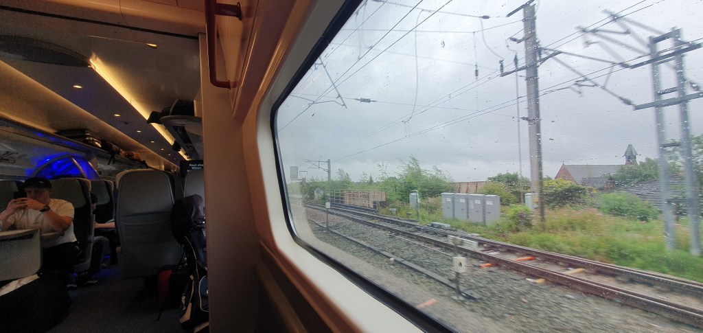 I’m finally heading in the right direction! I left my Northern service at Preston – as did many others which surprised me as I assumed the majority of folks were heading for Blackpool. Services on the West Coast seem to be in some disarray but I’ve no idea why at the moment. This time I’m unaffected and after getting a few shots in torrential rain joined the 14:18 Avanti Pendolino to Euston via Birmingham. It’s packed! So much for ‘no-one’s travelling by train anymore’. I’m perched on a tip-up seat by the toilets in coach D, although the friendly crew have told me the train’s due to empty after Crewe.