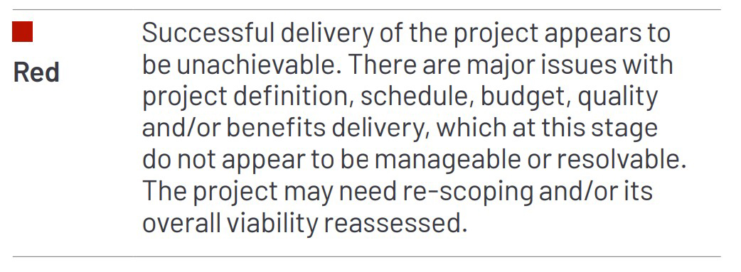 The IPA uses a colour-coded system to gauge how scheme are doing progress wise, they go from green to red. The ‘red’ rating is described thus;