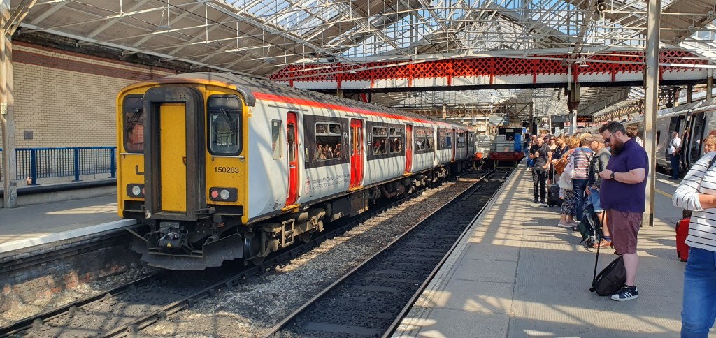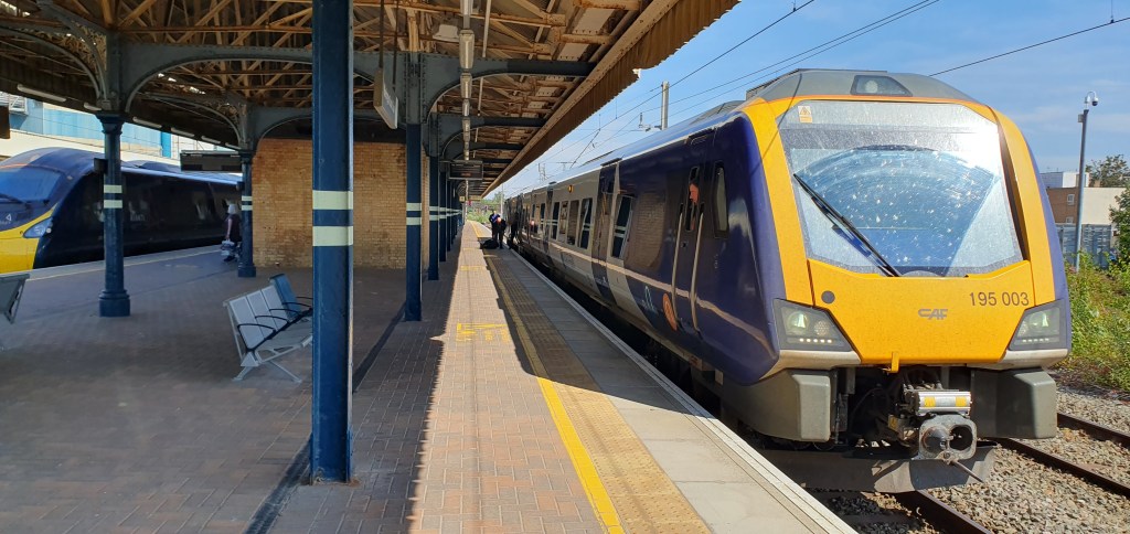 I’m currently on Northern’s 09:22 from Sowerby Bridge to Chester which I’m taking as far as Warrington Bank Quay. Formed of a 2-car Class 195 it’s been a busy little train all the way through the Calder valley as far as Manchester Victoria where many punters departed, only to be replaced by a smaller number of travellers heading West. The extra space has allowed me to set up my ‘mobile office’ in a free table bay and start this blog.