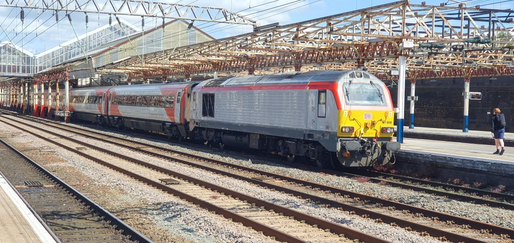 Ah, the fun of Crewe! I arrived on plenty of time to catch my onward connection and even had time to grab a few shots of trains under the skeletal canopies that ‘cover’ the stations Southern bays. The shadows their rusted ribs cast are quite atmospheric. I was here at a busy moment with trains aplenty. Pendolinos kept arriving from North and South whilst a Transport for Wales Class 67 loco-hauled set added to the atmosphere – and noise!