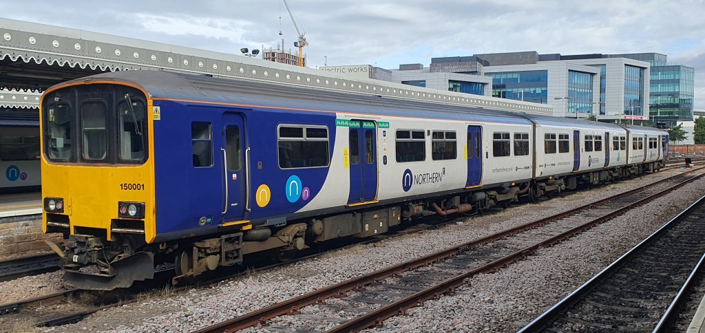 As I’d a few minutes to wait at Sheffield I hunted for suitable shots to take and found this. The very first of the BR built Class 150s, in between duties.