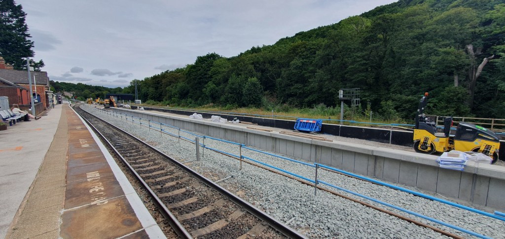 Arriving at Dore and Totley at the same time as the sunshine I quickly got shots of the Hope valley line upgrade work. The second Hope valley track through the station has been laid but isn’t connected. The new platform’s really beginning to take shape now and the foundations of the footbridge that will connect it to the existing platform are in place.