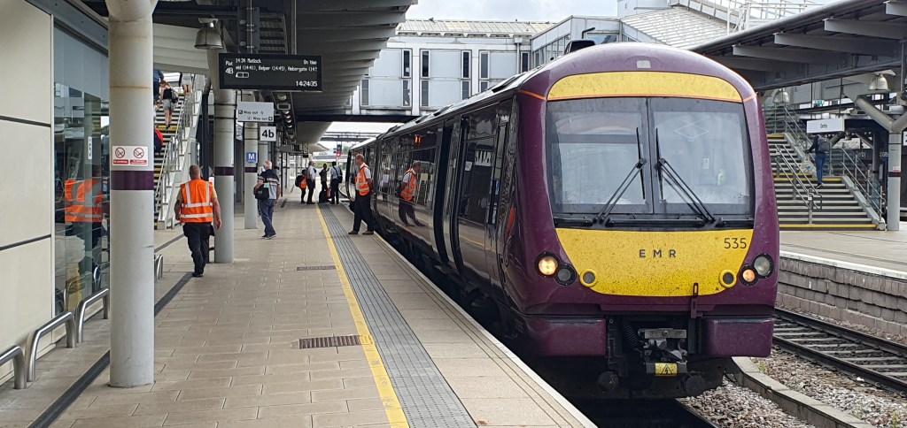 EMR has replaced their old BR built regional diesel train fleet of Class 153s and 156s with trains like this, the Class 170. Whilst they’ve received EMR livery the interiors are still pure West Midlands without USB or power sockets.