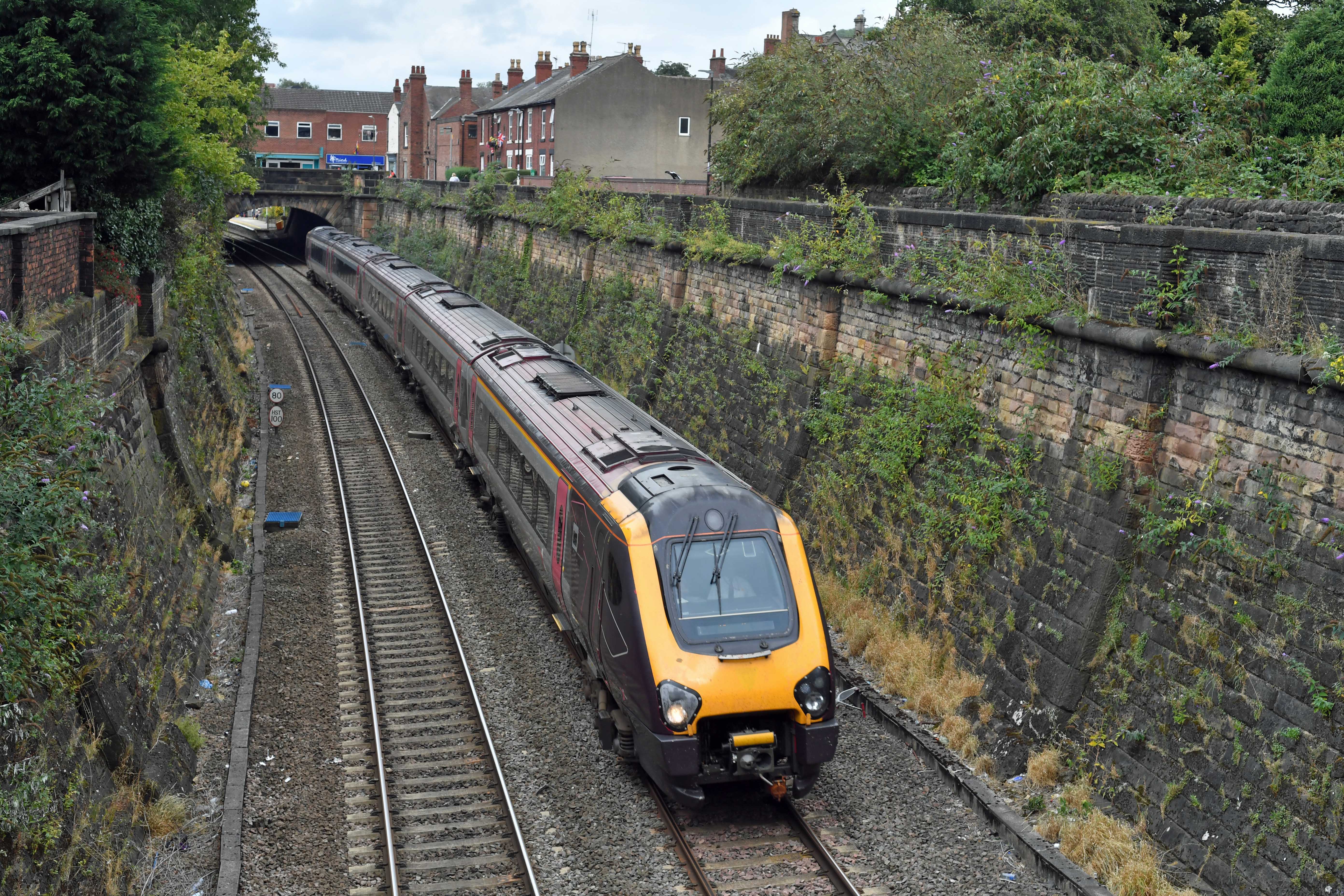 A Cross-Country Voyager speeds through Belper. The road along the top of the cutting is appropriately named ‘Midland View’. The bridge behind the train carries on of the main town centre shopping streets. You can view the station though the bridge.