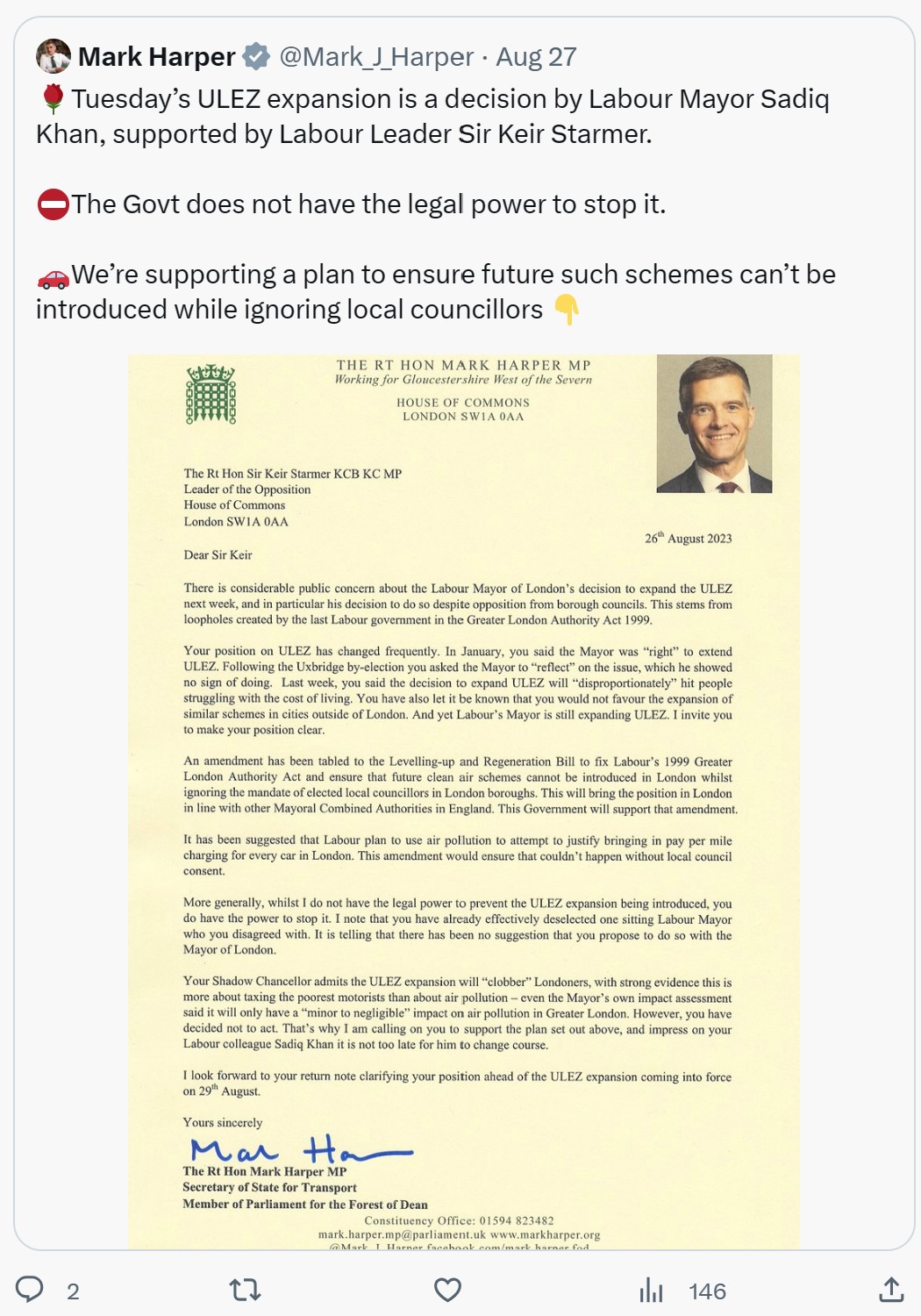 The Government doesn’t have the ‘legal power’ to stop it? Either this is a blatant lie (it is) or Harper hasn’t got a clue how UK democracy works (possible) or both (likely). Because the truth is the UK Parliament is sovereign and can make or change whatever laws it likes. And let’s not even get into the fact ULEZ was a Tory policy and one they’ve pinned on Sadiq Khan. Plus, there’s the fact most Londoners (who actually want to breather clean air) support ULEZ. So, you can see why the Dept of Transport is in a mess. It’s ‘led’ by a politician who’s a bit like a tortoise atop a fencepost.