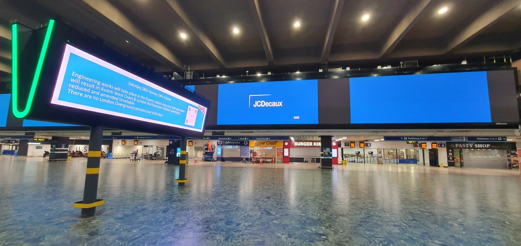 The last update. I’m now at Euston before calling it a day. It’s a nightmare of a sation nowadays as it’s far too small for the traffic it handles. The new ‘information’ screens don’t help. Commercial and political pressure has meant the vast majority of space has been given over to advertising.