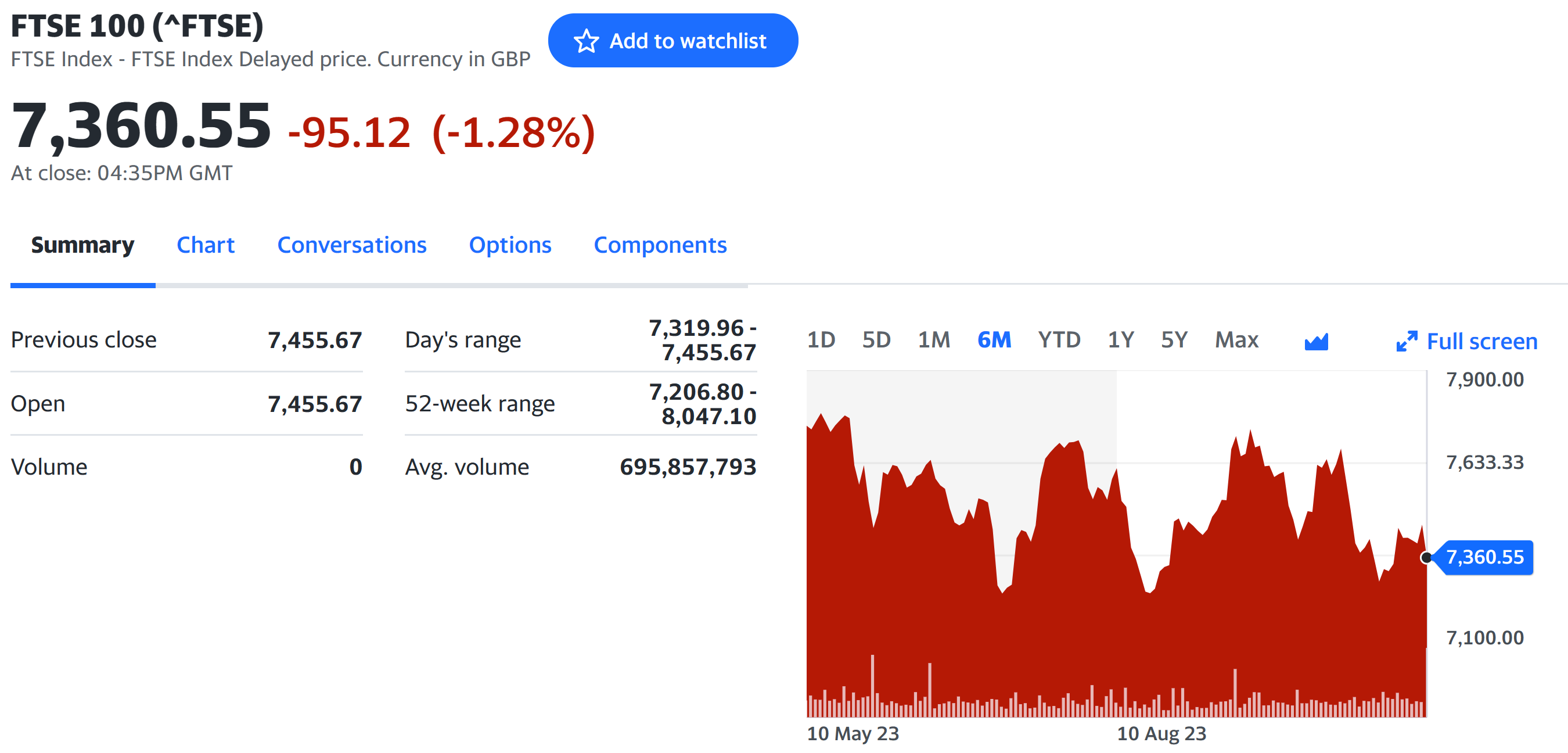 Which brings me back to the title of this blog. In all the Tory infighting, they’re forgotten what they’re meant to be here for. It’s the economy and the wellbeing and prosperity of the nation – only that’s been thrown under the bus (that same red one, the one that promised £350m extra for the NHS). Because if you look away from the infighting, you may just notice that the UK economy’s in the doldrums. Have you seen the stock exchange recently? Here’s how it looks today. Down 1.28% It’s been up and down like a bride’s nightie all year. This is the biggest fall in three months as news of the economy flatlining has broken. Having been hit by interest rate rises and inflation, we’ve narrowly avoided going into recession.
