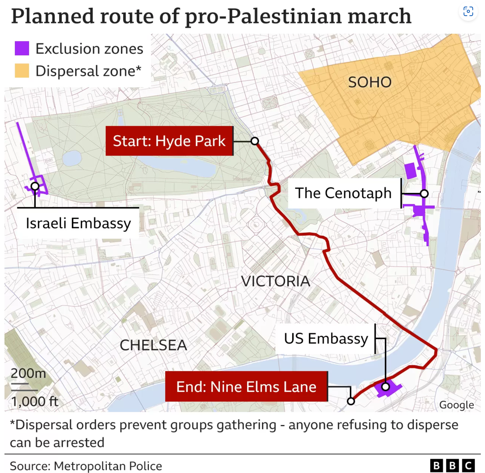 There’s just a couple of teeny-tiny problems with Braverman’s rhetoric. The protest march is scheduled for Saturday (Armistice day, not Remembrance Sunday) and it’s not planned to go anywhere near the Cenotaph, as this BBC map makes clear.