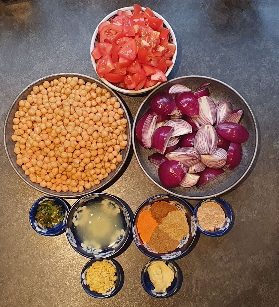 There’s no sign of these conditions letting up either, which is bad news for farmers trying to cope with flooded fields in the sowing season. My recent travels have made me appreciate just how much of the countryside remains sodden after record rainfall. Hopefully, I’ll be able to get out with the camera later in the week if conditions improve. In the meantime, there’s always work to do at home – although some of it can be more of a pleasure than a chore. Like today’s picture. I haven’t posted one of these for a while but tonight I took over the kitchen from Dawn to assemble a spicy dish that’s become a staple dish for stocking up or freezer – Chana Masala. Here’s the raw ingredients, prepped and ready for cooking…