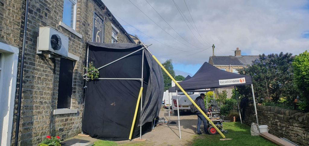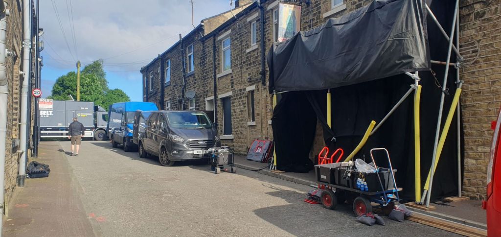 On my walk to the station I couldn’t resist taking a detour past the Big 6 to see what the film crew were up to. The surrounding streets are now clogged with trucks and vans whilst the pub itself has disappeared behind scaffolding which is holding the blackout curtains in place.