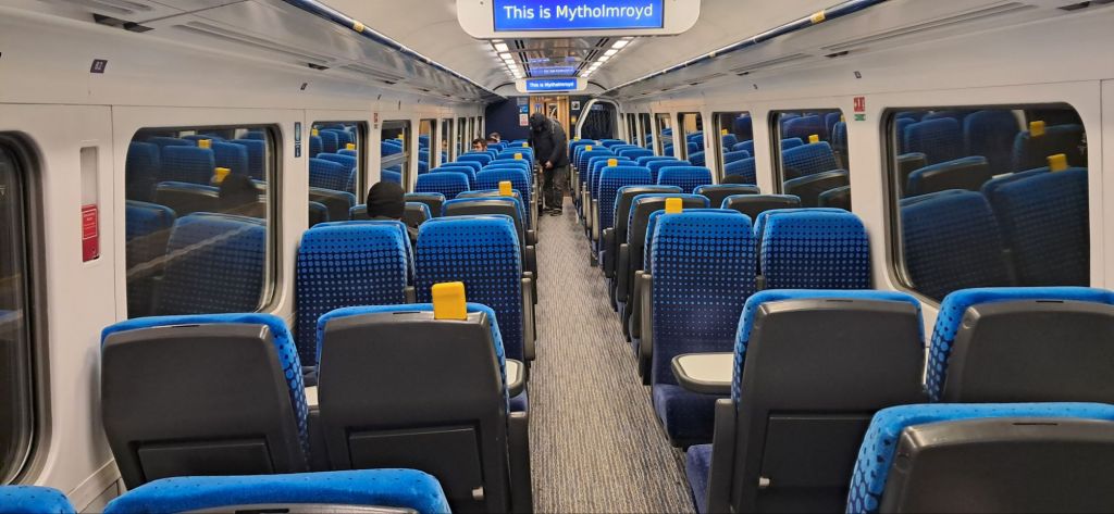 As expected my train slowly filled up en-route but was way over half full by the time it left Rochdale which is the busiest station on the route after Halifax. The occupants are a mix of trades people heading into the city to work on various building projects and earlybird white collar office or shop workers.