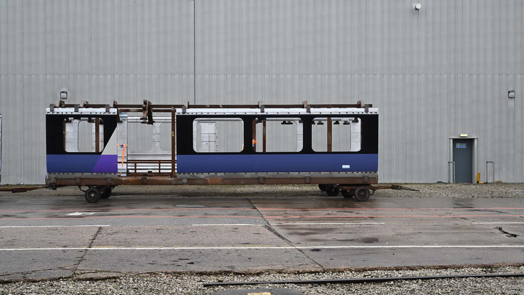 Painted bodysides complete with windows, internal insulation and some cabling waiting to be put on a jig where they’ll be joined to roof and floor sections.