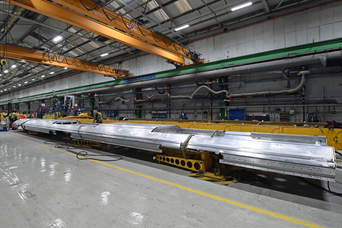 Building trains at Derby is like assembling a kit of parts. Here’s the welding shop where aluminum sections brought in from off site are joined together to form frames, roofs, bodysides and other sections.