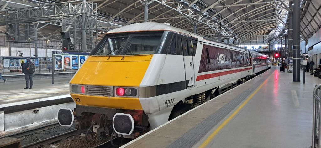 As always, Leeds was busy. Whilst I wasn’t there long LNER came up with a trio of Class 91s in 15 mins. Here’s 91127, a local celebrity as it’s named after the city’s main rail depot – Nevill Hill.