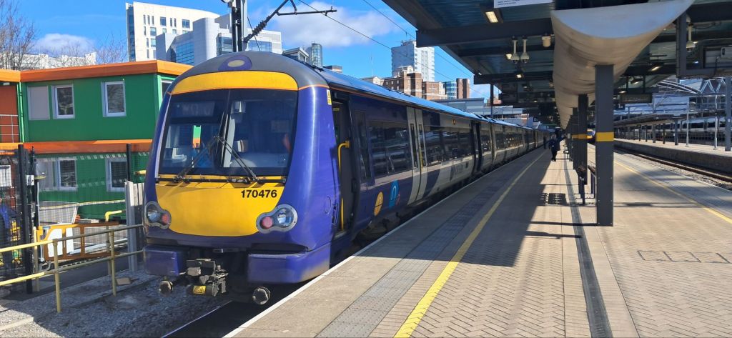 Having explored the Harrogate loop line the other week I’ve decided to retrace my steps in the hope of getting pictures of some of the things I discovered – but missed out capturing on camera. Right now I’m on the 10:58 from Sowerby Bridge, heading for Leeds. There’s plenty of room on this train as it consists of two 2-car Class 195s, making it easy to bag a table bay and set up the mobile office. Let’s see how the day goes…