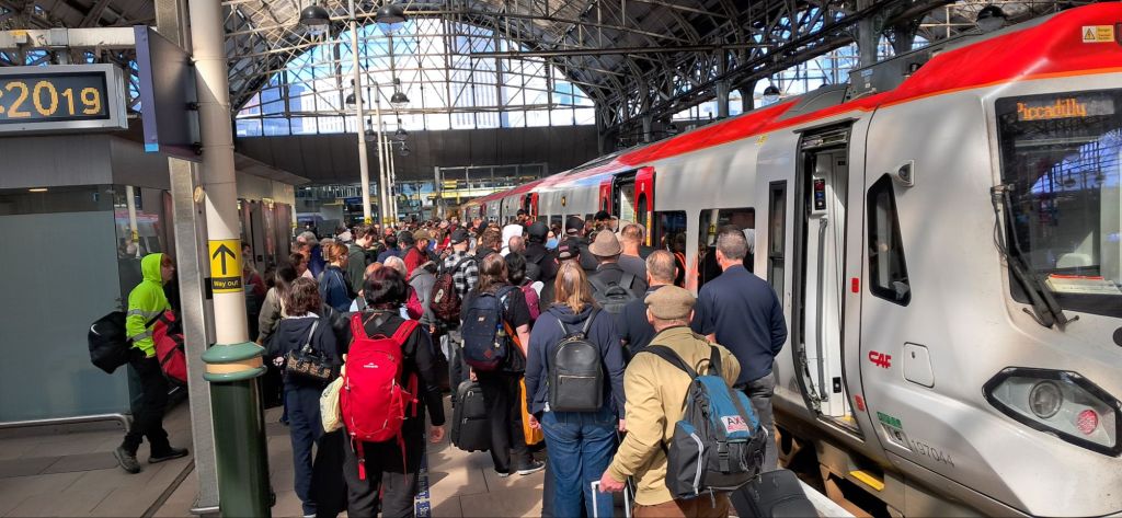 As expected, this train’s almost full after leaving Rochdale, having picked up other passengers en-route. We’re now speeding towards Manchester under clear blue skies.
