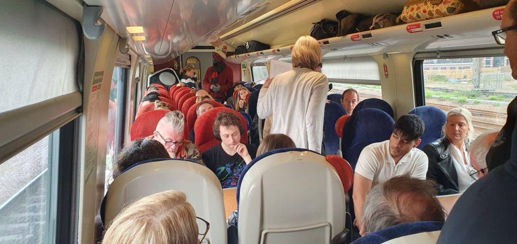 Well, this is ‘fun’. I’m on Cross-Country’s 11:11 to Plymouth, which is a single 4-car Voyager, and it’s absolutely packed! I’m stood in the leading car along with five others and another six in the vestibule by the disabled toilet.