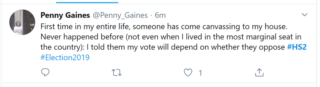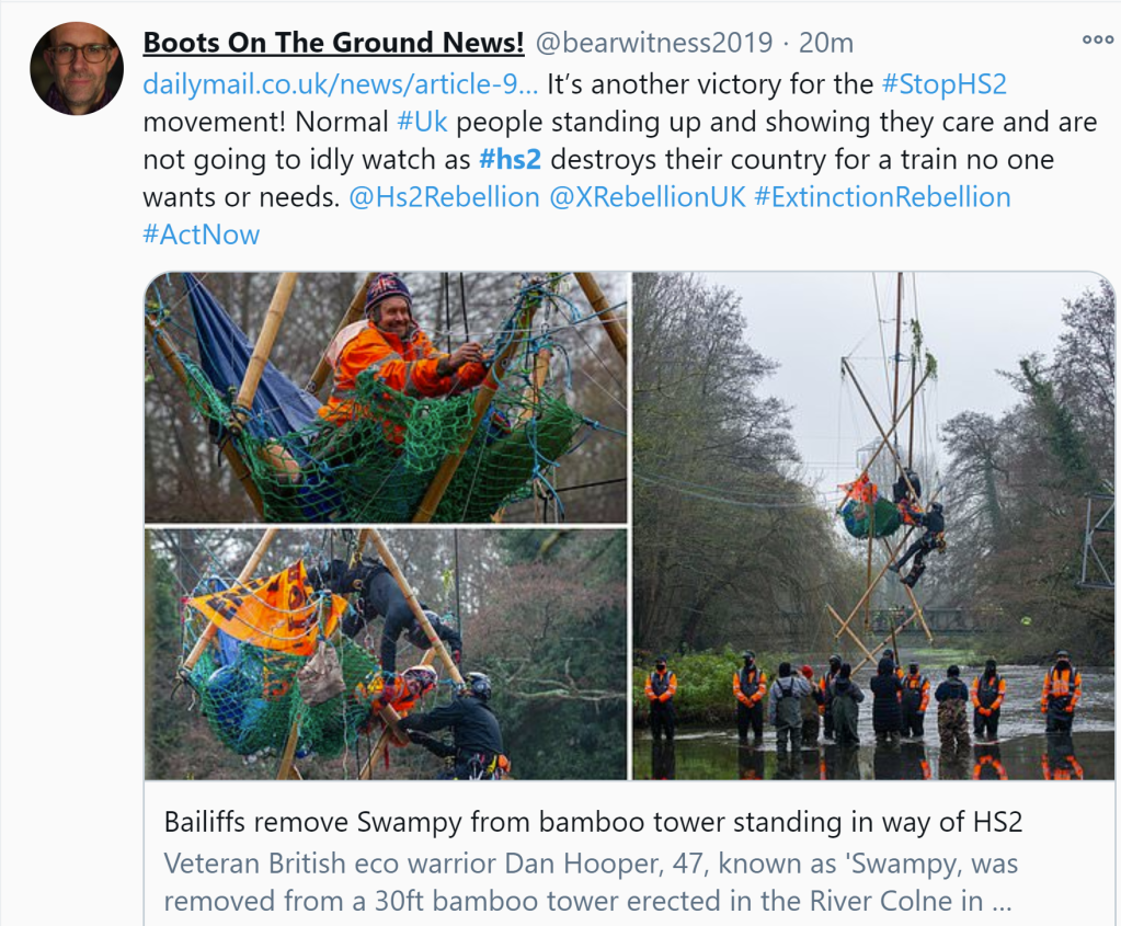 So, there’s really nowhere for the remaining opponents of HS2 to turn. They’re a dead duck politically and the protesters are finished. All that’s left is a dwindling bunch of Nimbys, right-wing libertarians and faux ‘greens’ wasting their time ranting in their social media echo-chamber. No-one sees them as a threat to HS2.