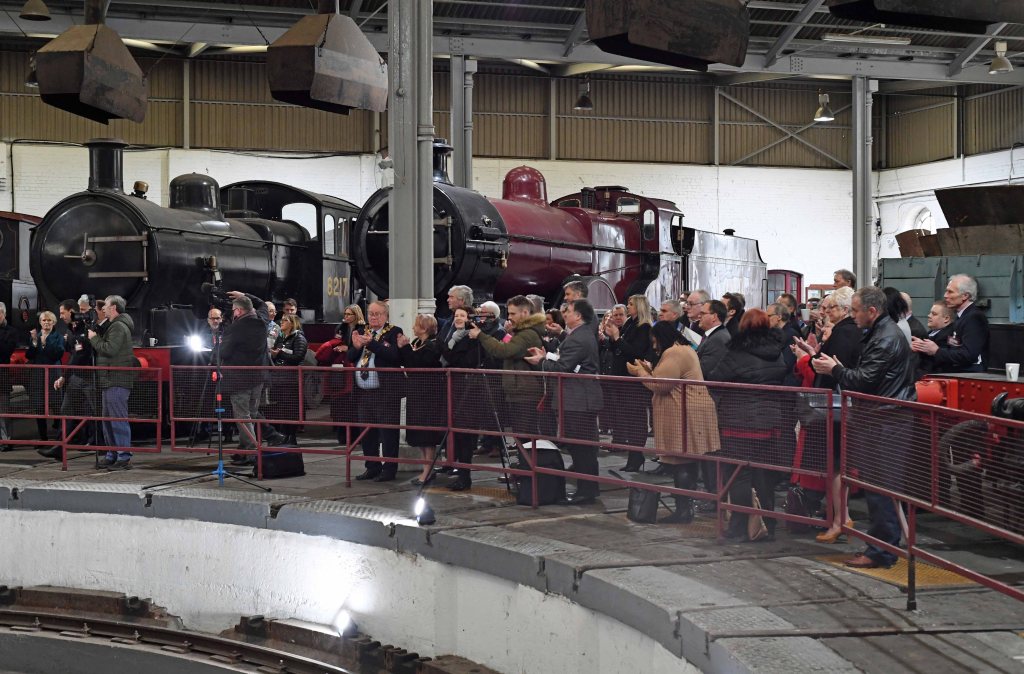 The invited audienc look on as the TALGO train is handed over at Barrow Hill roundhouse.