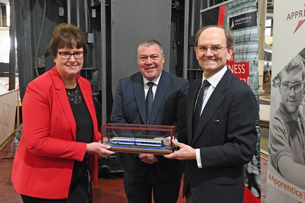 L-r. Cllr Tricia Gilby receives a model of a TALGO train from, Jon Veitch, MD of TALGO UK and Carlos de Palacio, President of TALGO.