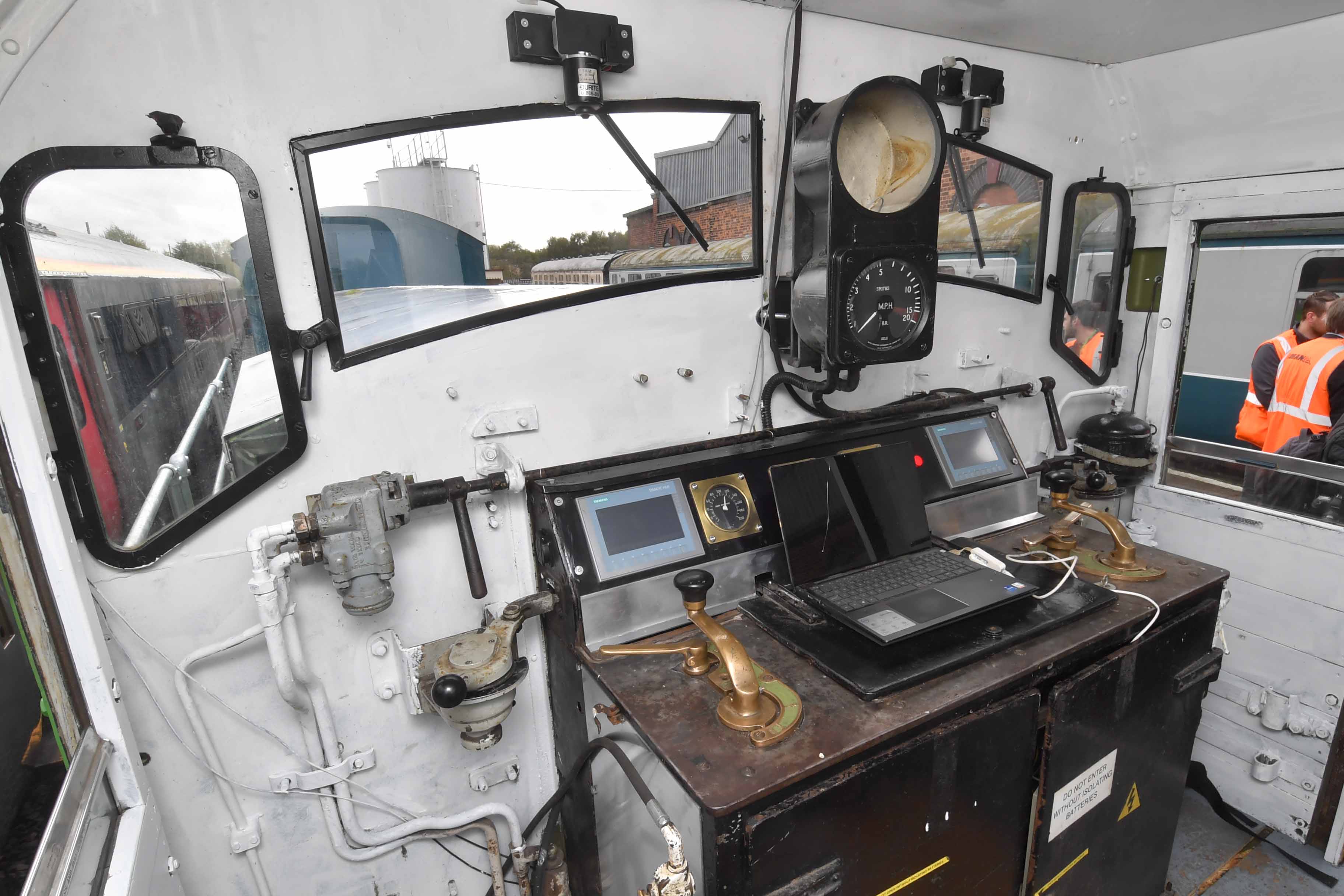 The 08e cab showing the mix of old and new. The extra windows above the cab desk that have been fitted thanks to removal of the old fuel tank, diesel engine and subsequent bodyshell reduction are the most obvious change. Plus the LCD screens in the control desk.