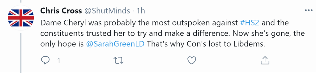 Culver only managed to attract 1,480 votes, a fall of over 51% on their 2019 result. Yet HS2 is meant to be the issue that ‘swung’ it for the Lib-Dems? Of course, blaming HS2 is a convenient smokescreen for some people. It’s noticeable that so many right-wingers are doing exactly that as a ‘look over there’ tactic to avoid talking about what’s likely to be a much more important issue – Brexit and the shambolic performance of the Government on a range of of issues, including Covid and the economy. Plus, blaming HS2 fits their narrative. The right have always despised the project as it’s public infrastructure, hence the likes of the Taxpayers Alliance and IEA always banging on about it. Both big Brexit supporters, you can see why they find it convenient to use HS2 to say ‘look over there’. You can see this phenomenon most on Twitter, where anonymous ‘flag-shagger’ accounts like this one who retweet the likes of John Redwood and the ‘Guido’ website have gone into overdrive.