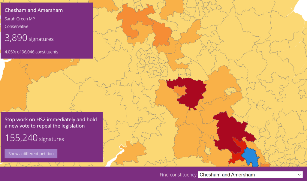 There’s another clue that the issue of HS2 has been exaggerated thanks to a petition on the Government website that (co-incidentally) closed after 6 months on polling day in Chesham. Started by celebrity petrolhead and car advertiser (don’t you mean ‘environmentalist’? Ed) Chris Packham and backed by the Green Party, Extinction Rebellion and a rag-bag of political interests from left and right, it managed a measly 155,000 signatures UK-wide. To put that into perspective 2.6 million live in constituencies affected by HS2. So, how many signed in Amersham? Actually, it got the best result of anywhere in the UK, but that’s nothing to crow about! Just 4.05% of C&A’s 96046 constituents signed it in 6 months. Which means 96% couldn’t be bothered. Yet (supposedly) they could be bothered to change their long held political allegiences for the very first time in yesterday’s by-election. I smell bovine excrement…