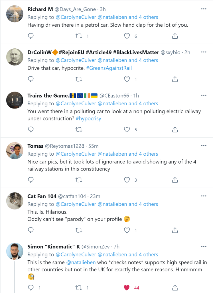 Hang on, how can someone who’s educated and worked most of her life in PR and Comms be so tone deaf and inept? Her campaign’s a PR car-crash – literally! Here’s a classic example from this week, when another ‘Green’ party car crash (Natalie Bennet of ‘brain fade’ fame) popped in. What did the two of them do? Toured HS2 worksites – in a 2014 built petrol-driven car! Here’s a Green party candidate who opposes building a green electric railway that we need to get modal shift from road/air to rail to tackle global climate change and she’s touring around the sites in a petrol driven car!
