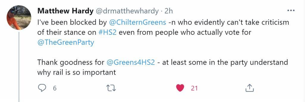 Things haven’t got any better with the ‘green’ party. Exactly the opposite in fact. Seemingly stung by the criticisms of their campaign, the Chiltern ‘green’ party has resorted to blocking anyone on Twitter who has the temerity to question the wisdom of their campaign – including other Green party members and voters!