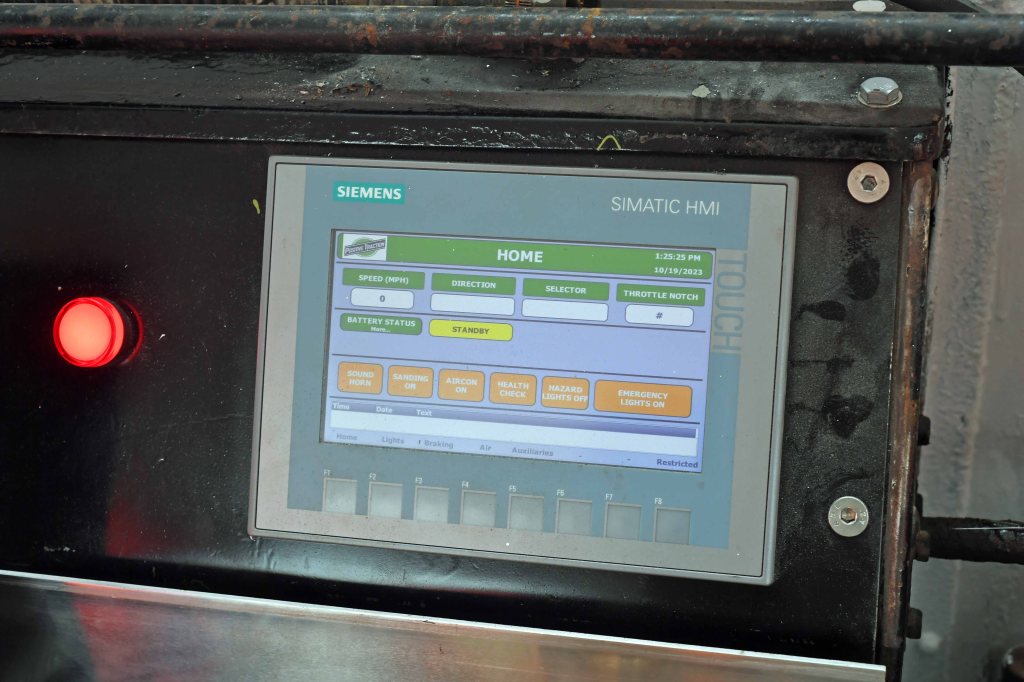 The old English Electric diesel engine’s been replaced with Lithium-Ferro-Phosphate (LFP) 88kwh batteries supplied by Lithion Battery Inc. Up to six ‘plug in’ batteries can be fitted under the new, lower body which has replaced the fuel tank, engine and radiator assembly. The batteries and control equipment module are designed to be able to be changed in minutes using a forklift truck.