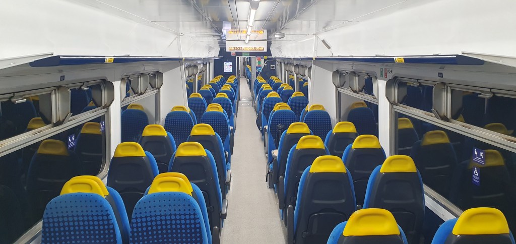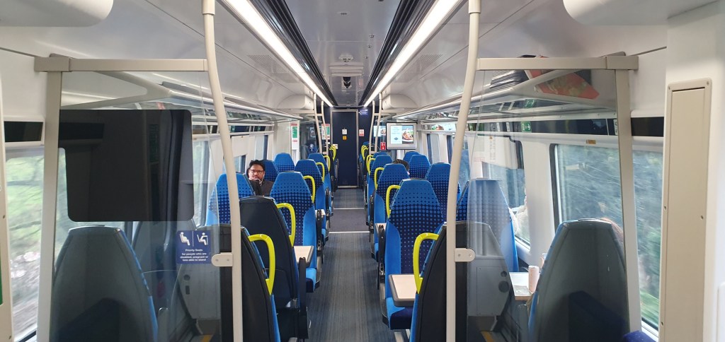 So, this morning I decided that as the weather’s picking up and I’m fed up of being cooped up in the office I’d venture out on the hunt for some of these trains. Right now I’m on a late-running York – Blackpool North service from Halifax bound for Preston. For once I’m glad the trains a few minutes late, otherwise I’d have missed catching it! The doors had already closed as I dashed onto the platform but the friendly young conductor me-mo’d to be to get on through her door. I’m now settled at a table with the mobile office up and running. This is a quiet train, so I can work undisturbed.
