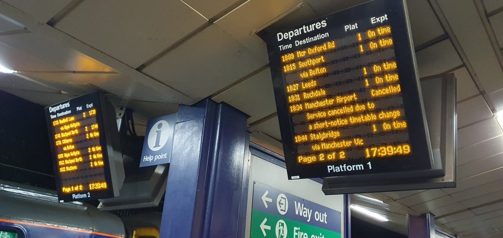 I stayed long enough for a slow pint and chat with the landlord. I was pleasently surprised to find this place so I doubt it’ll be my last visit. Tearing myself away I finally caught up with a Class 319 which was stopping on its way back to Blackpool. My plan was to catch it to Preston where I’d connect with the 16:44 service back to Halifax. Surprise, surprise – when I got to Preston I found the 16:44 was cancelled. Now I’m heading into Manchester instead. Only the connection with the train I’m on has also been cancelled! I give up trying to plan now – I’m simply going to catch the first train heading in the right direction that turns up!