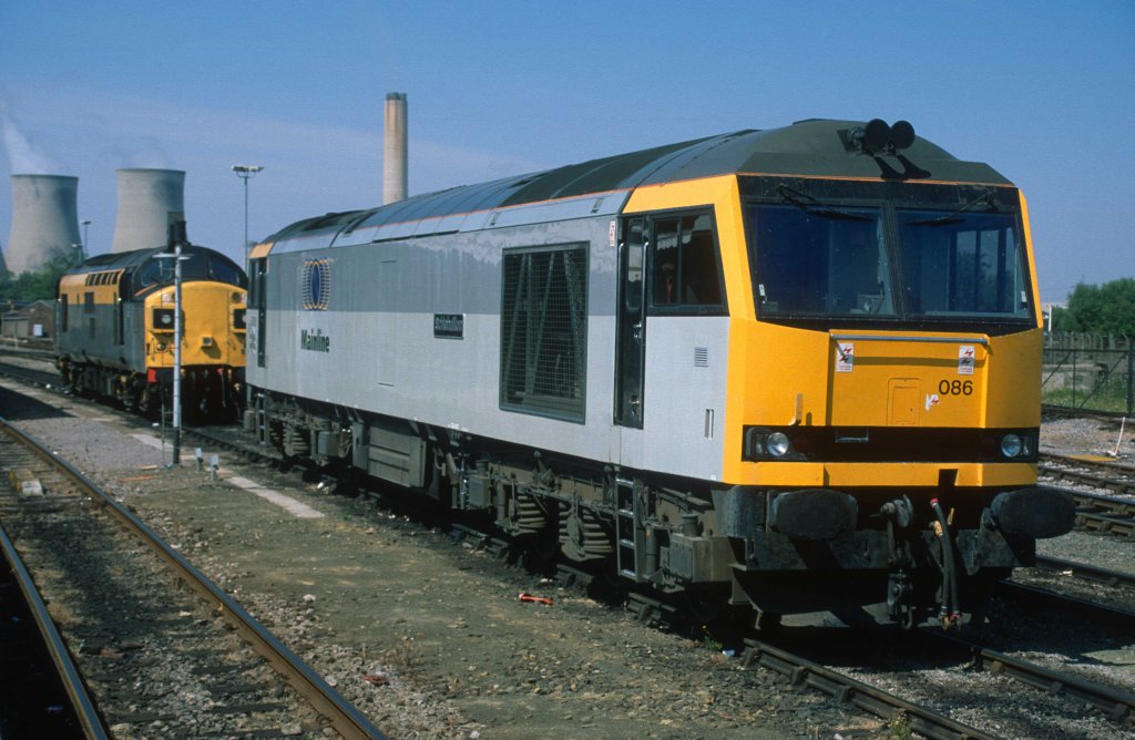 60086 ‘Schiehallion’ sits in the stabling sidings at Didcot on the 21st August 1995. It was one of the locomotives allocated to Mainline freight, one of the three companies the BR freight sector was broken up into ready for privatisation. It, Loadhaul and Transrail were all bought by EWS and amalgamated. 60086 was withdrawn by EWS as long ago as October 2005.